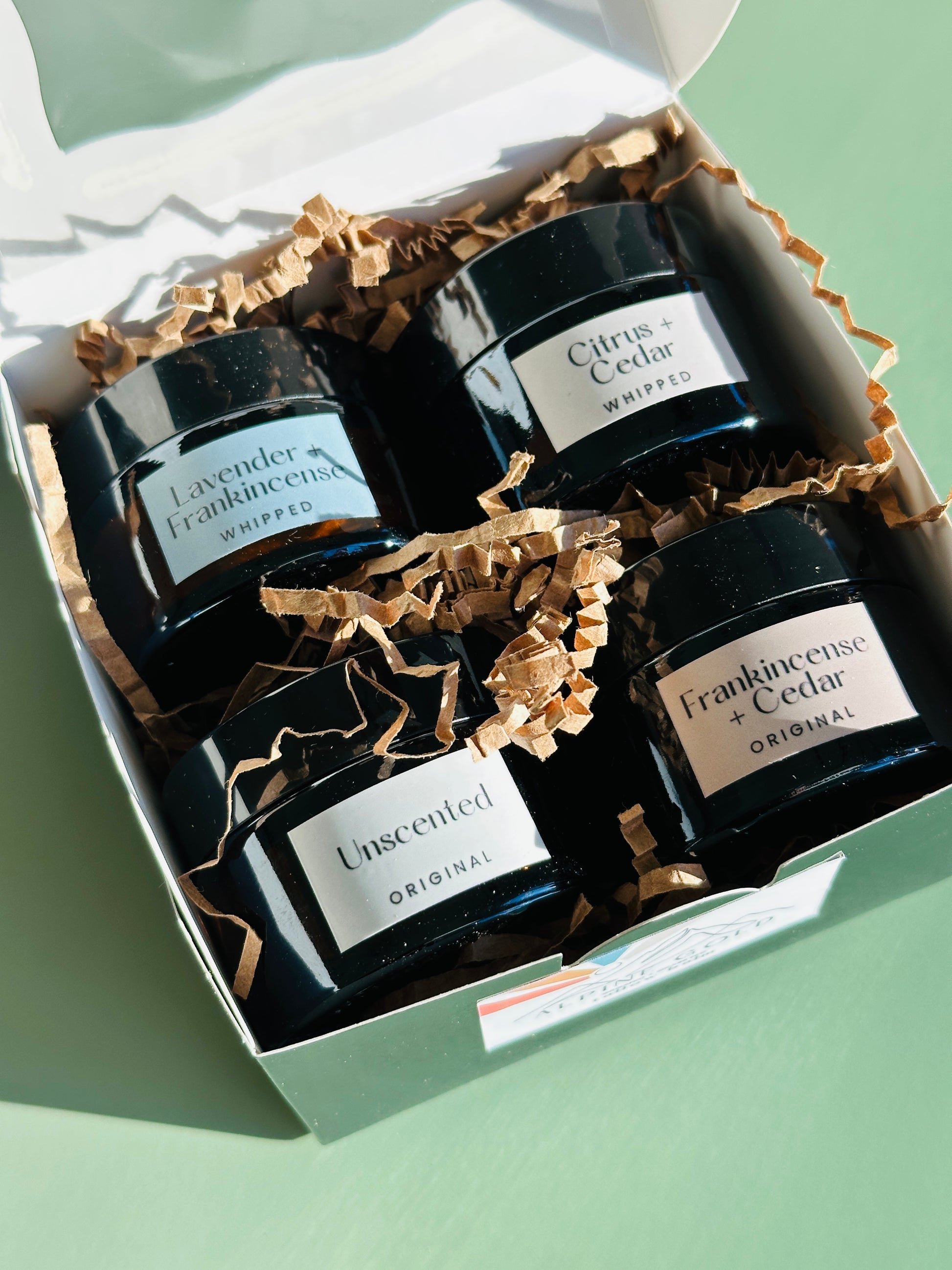Lavender + Frankincense (Whipped): A soothing floral blend that feels light, airy, and deeply calming.